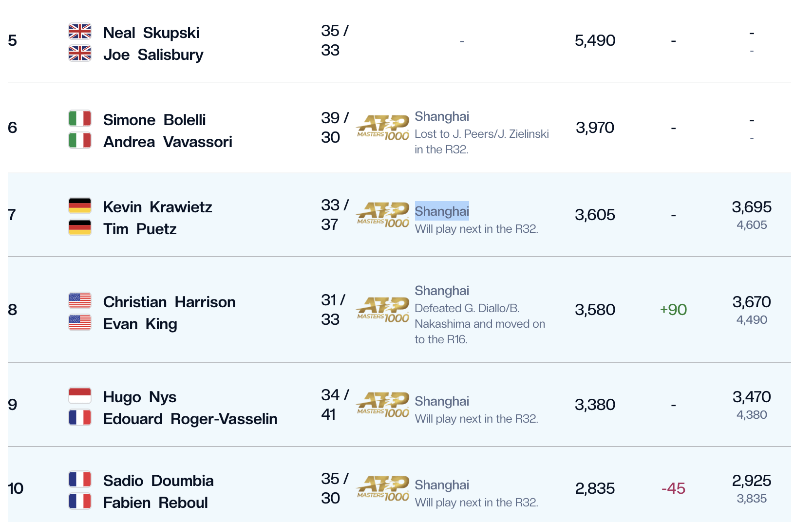 Bolelli e Vavassori restano sesti nella race di doppio con 3970 punti, ma la strada per Torino non sarà in discesa. I punti di Shanghai avrebbero fatto comodo agli azzurri, non tanto per colmare il gap con Skupski e Salisbury (5490 pt.) quanto per allungare sugli avversari ancora tutti in corsa nel torneo.