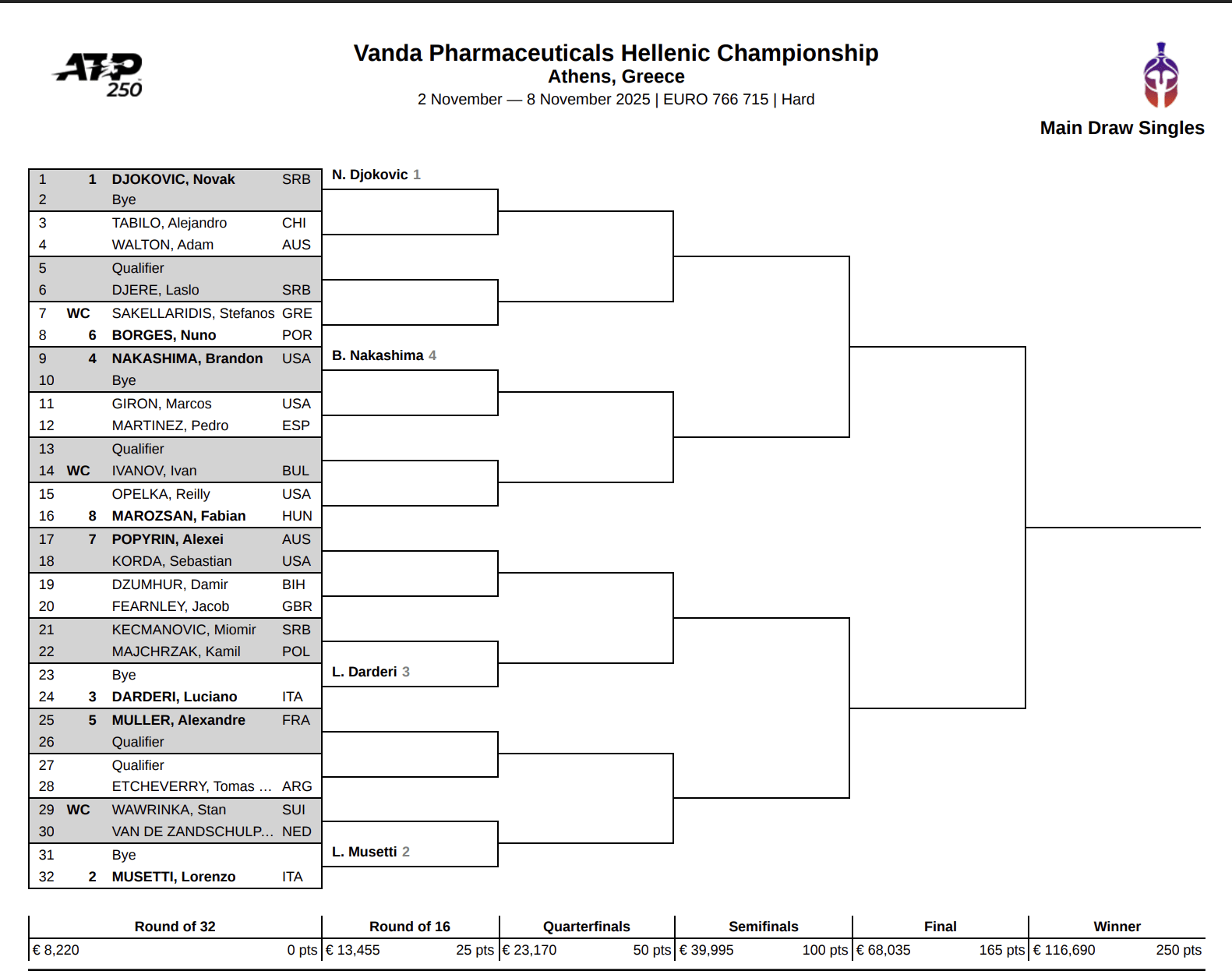 Non solo Djokovic o Musetti, il nuovissimo torneo di Atene può vantare un buon mix di talenti e nomi d’esperienza. Basti pensare al primo turno Wawrinka vs Van de Zandschulp, da cui uscirà il primo avversario di Musetti. Ma anche il possibile quarto di finale fra Darderi e Popyrin, il quale però dovrà prima vedersela con Sebastian Korda. Proprio Darderi sarà un osservato speciale ad Atene, dove potrà confermare l’ottima crescita di questo 2025 e porre le basi per un 2026 da salto di qualità.