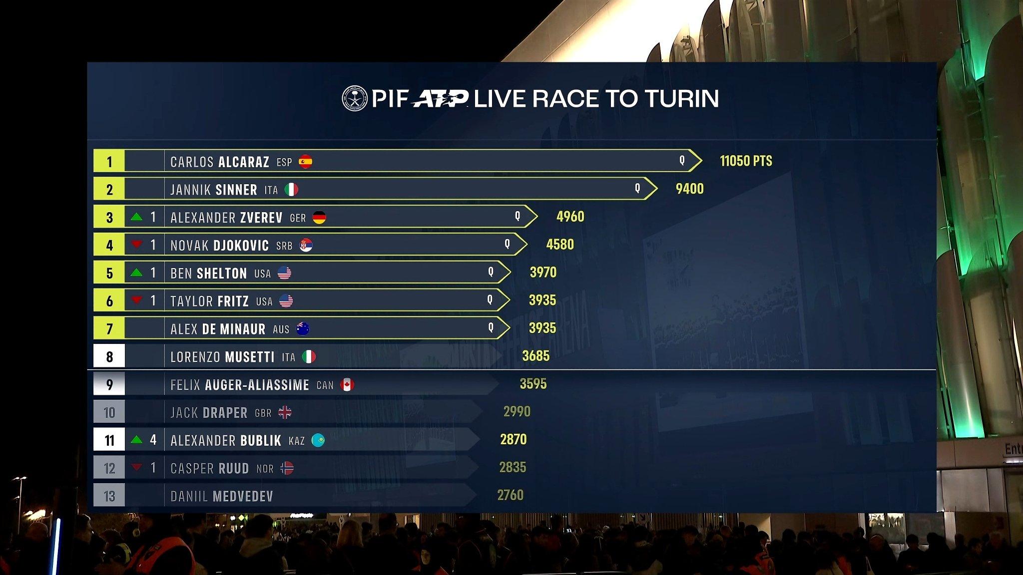 Con sette posti già occupati, la corsa per la qualificazione diretta si è ridotta a un posto per tre giocatori, come detto Musetti, Auger-Aliassime e Bublik. L’italiano attualmente tiene l’ottava posizione forte di 3.685 punti, bottino che spera di rimpolpare ad Atene. Il canadese ha la possibilità concreta di superare Musetti, e in caso di vittoria oggi con Bublik andrebbe ottavo a 3.845 punti. Il kazako è più indietro, e le possibilità di un accesso fra i primi 8 (come detto sopra) sono remote. Per Bublik una vittoria a Parigi significherebbe arrivare a 3.470 punti, e con gli eventuali 250 punti a Metz andrebbe a 3.720.