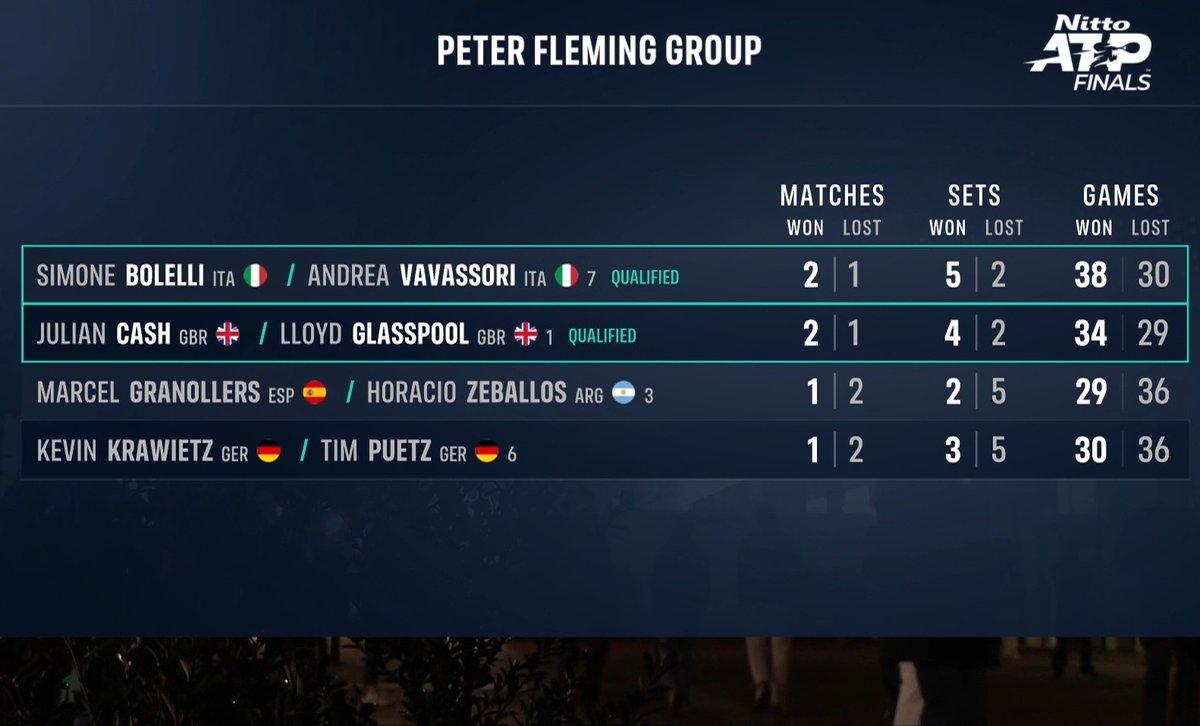 I britannici numeri 1 del seeding Lloyd Glasspool e Julian Cash hanno raggiunto la semifinale delle ATP Finals 2025. Niente da fare per i finalisti del 2023 Granollers e Zeballos, eliminati da ultimi nel gruppo Peter Fleming con una sola vittoria. Confermate quindi le due coppie che hanno primeggiato nel girone, quasi dominato da Bolelli e Vavassori. Cash e Glasspool troveranno in semifinale altri due britannici, Salisbury e Skupski che hanno ottenuto il primo posto nel gruppo John McEnroe.