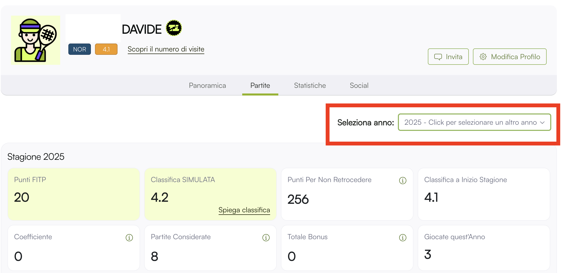 I match giocati dal 2 novembre in poi su TennisTalker vengono già conteggiati per la stagione in arrivo. Per visionarli basta cliccare sulla tab Partite (vedi esempio), e selezionare l‘anno 2026 nel menu a tendina. Lì verranno mostrate le partite più recenti, divise da quelle precedenti al 2 novembre conteggiate invece nella classifica conseguita a fine anno.
